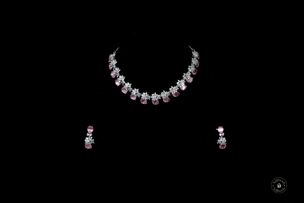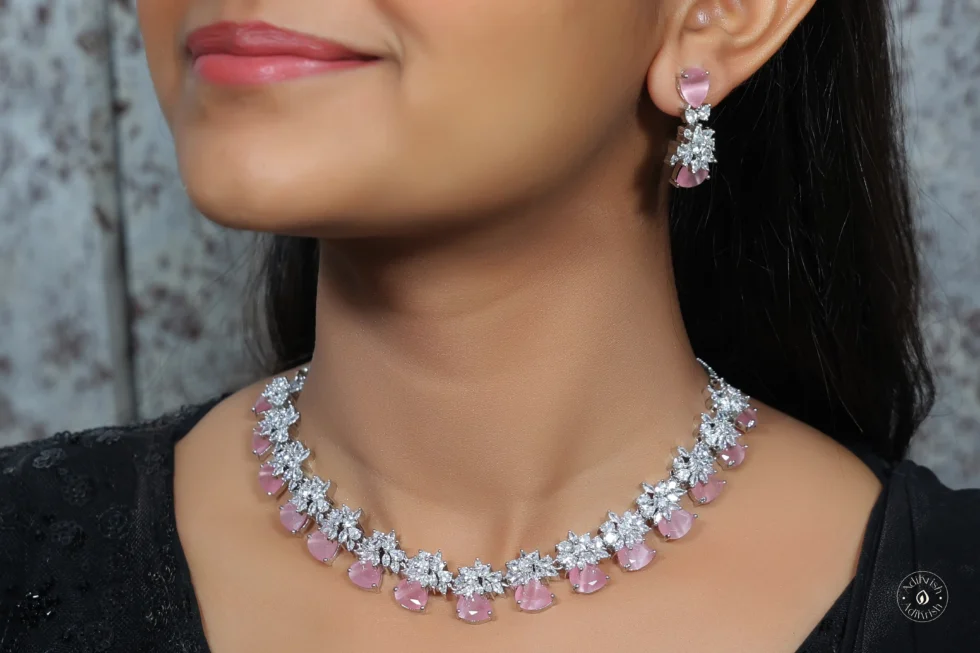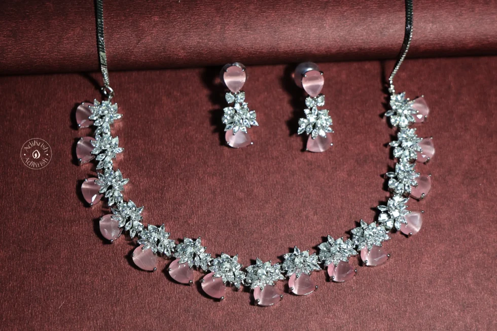 Floral American Diamond Necklace Set (Pink)
